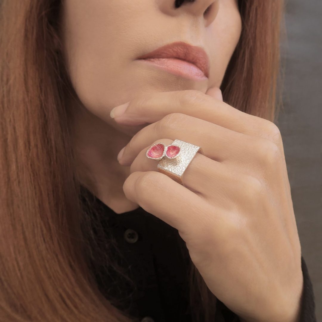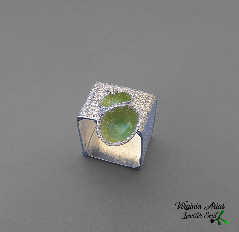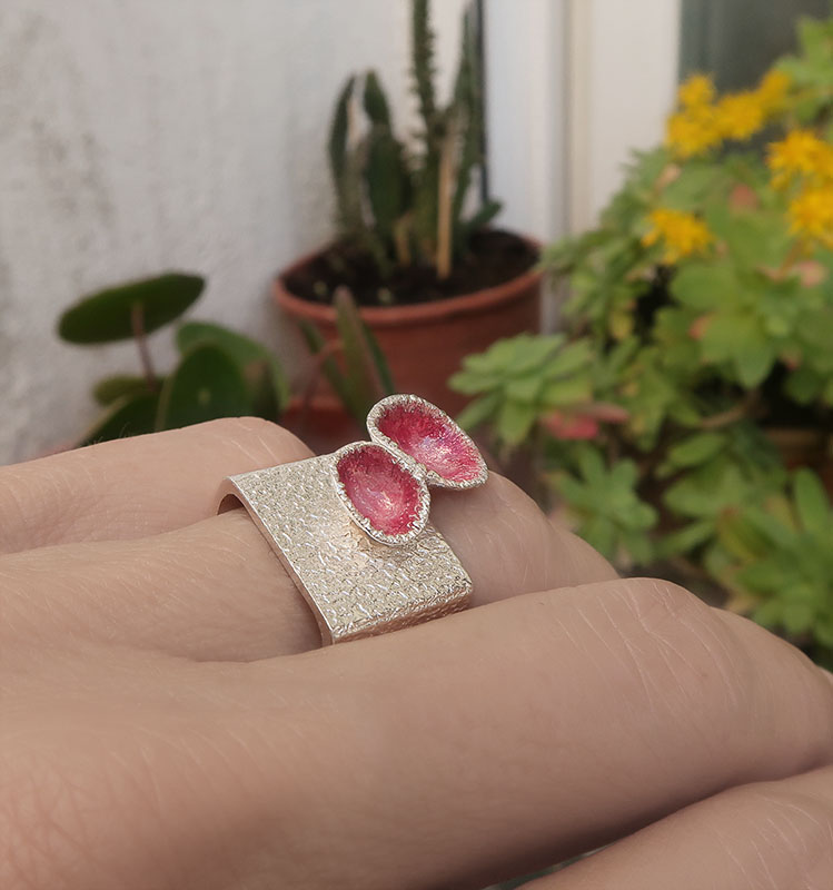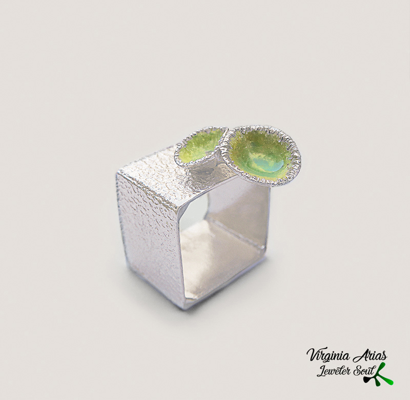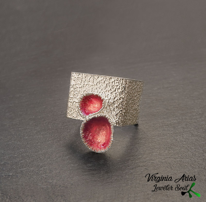 Handmade Organic Square Ring. This statement ring was made with sterling silver and enamel. All ring has a beautiful texture and small bowls with enamel on the front of the ring, showing a contemporary and organic look.